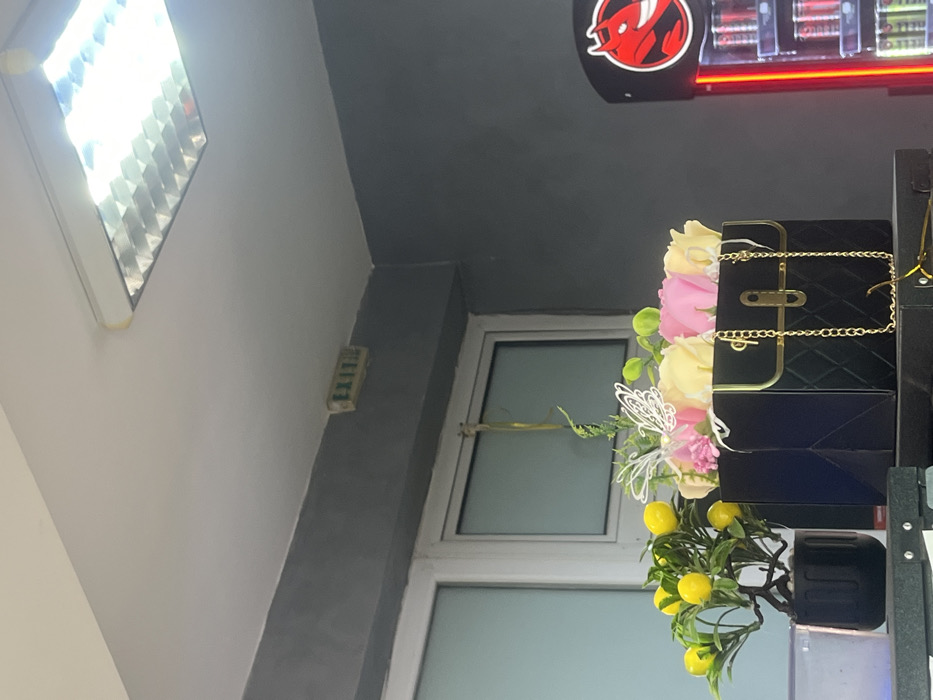 The image depicts an indoor scene in Unknown, Unknown, likely a commercial or office environment. In the foreground, a black quilted box resembling a handbag contains an arrangement of artificial pink and cream roses, greenery, and a white butterfly ornament. To its left, a small artificial lemon tree in a black pot is visible. Further right, a red and black commercial beverage cooler with a red devil-like logo is partially seen, stocked with multiple cans. The background features a white-framed window. Above, a fluorescent light fixture illuminates the white ceiling and gray walls. A small, indistinct "EXIT" sign is mounted on the wall below the ceiling line in the upper left quadrant. No individuals are present.