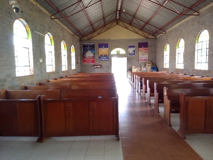 This image captures the interior of a vacant religious hall, likely a church, located in Ndeiya, Kenya