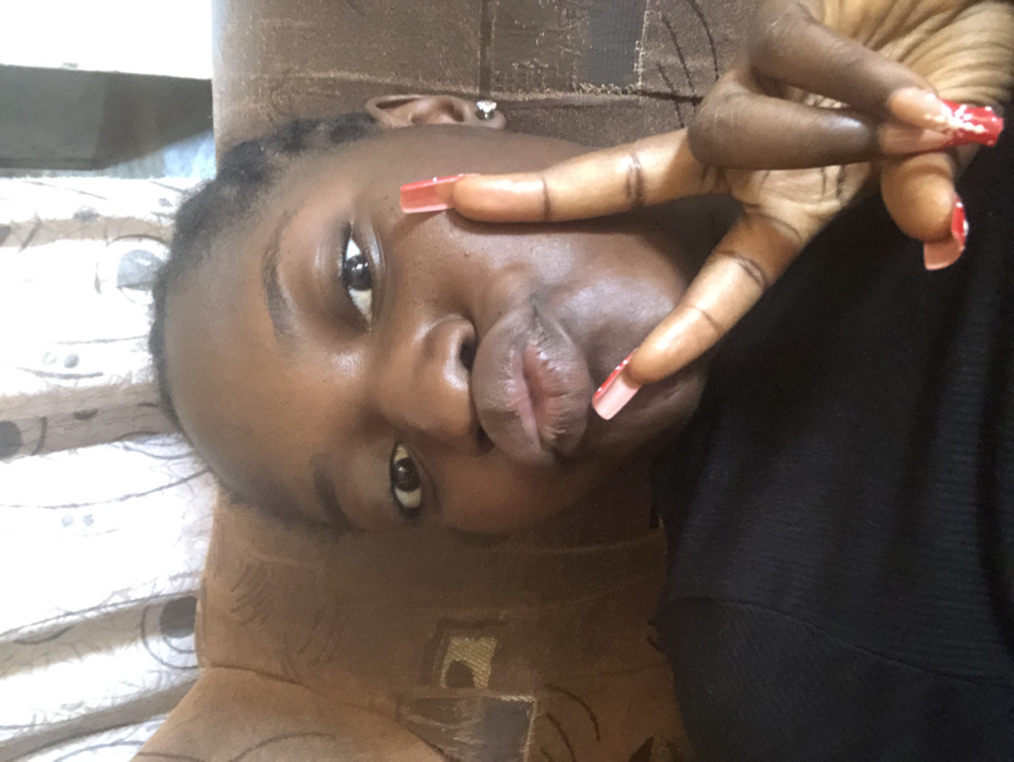 The image captures a close-up selfie of a dark-skinned female individual in an indoor setting in Rido, Nigeria