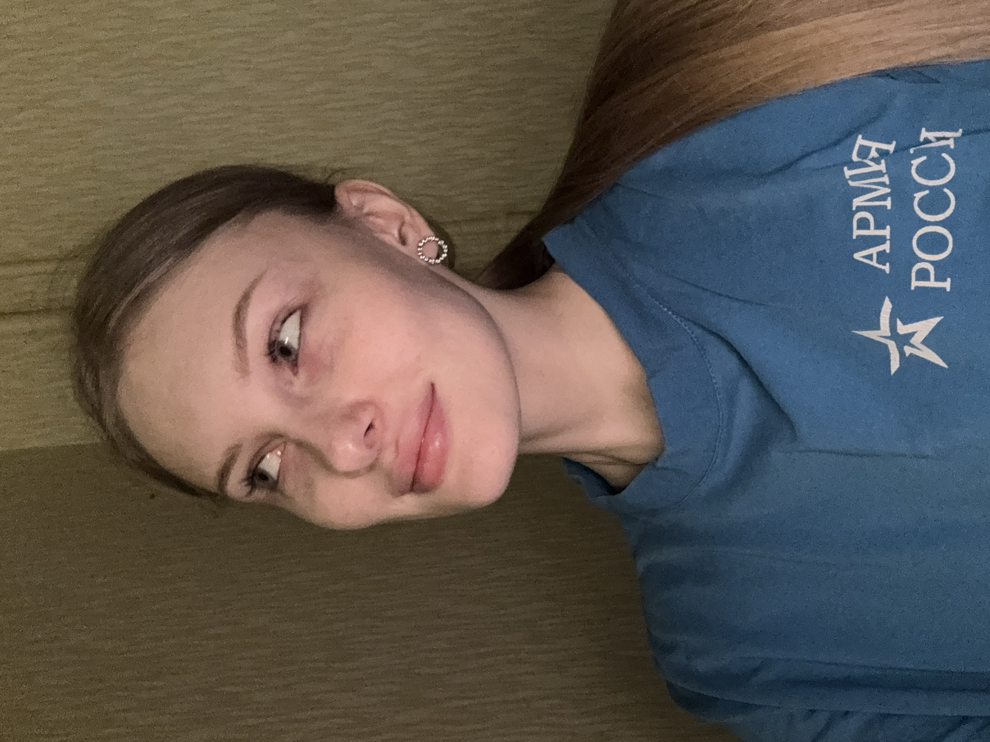 A young female, appearing to be in an indoor setting, is depicted from the upper torso upwards. She has long, light brown hair styled to her left side. Her head is tilted slightly, and her gaze is directed upwards and to her right, with a subtle smile evident on her lips. She wears a light blue crew-neck t-shirt. The shirt features white text on the chest, which reads "АРМИЯ РОССИИ" (Army of Russia), accompanied by a five-pointed star emblem. A silver-colored, textured hoop earring is visible on her right ear. The background consists of a plain, light brown wall, possibly textured, under soft, indirect illumination. The specific indoor location within the city of Кондратово, Russia, cannot be determined from the visual information provided.