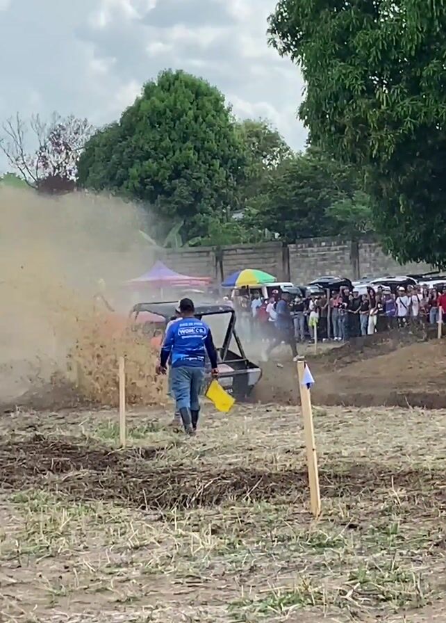 The video captures an off-road vehicle navigating a dirt track, kicking up dust and mud. A crowd is seen lining the track, separated by a barrier, watching the event. Several individuals stand closer to the track, appearing to be officials or event staff. The setting is an open field with trees visible in the background and a cloudy sky above. There are tents and parked vehicles visible behind the crowd.