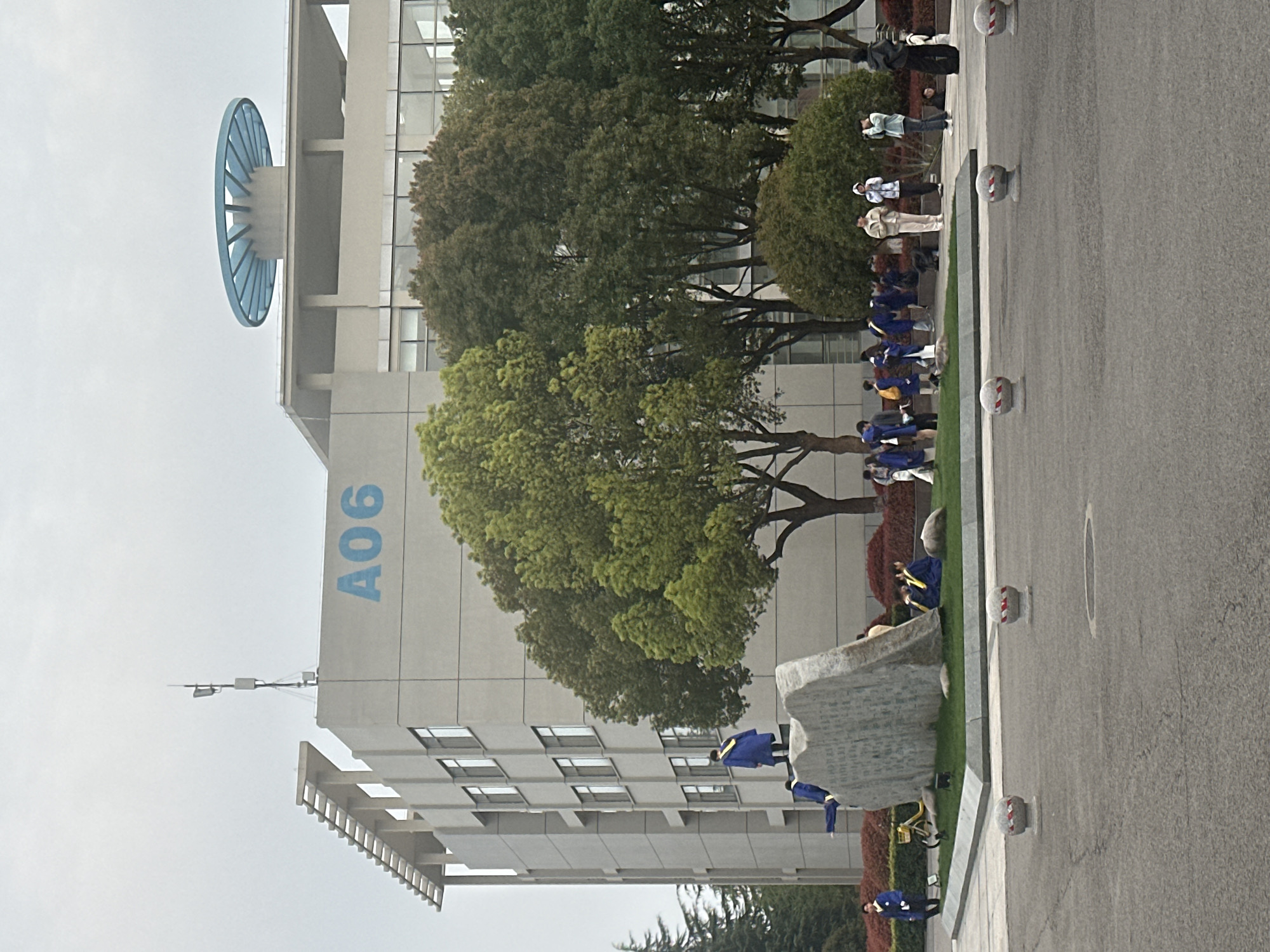 This image depicts an outdoor scene at the Jiangning Campus of Nanjing University of Aeronautics and Astronautics (NUAA), located in Jiangning District, Nanjing, China. The central background features a modern, multi-story building constructed with light grey facade panels and numerous rectangular windows. The number "A06" is prominently displayed in large blue lettering on its upper left section. The roof of this building features a horizontal pergola-like structure on the left side and a communication antenna mast with multiple components. To the right, another section of the building is visible, featuring large glass windows on its upper floors and crowned with a distinctive large, blue, open-lattice circular structure on its roof. In the mid-ground, a landscaped island with green grass is visible. A large, irregularly shaped, light-grey boulder monument with etched characters on its surface is centrally placed on this grass patch. Reddish-brown shrubs border the island, and several mature trees with green foliage stand behind and around it, partially obscuring the buildings. Approximately 20-30 individuals are present, many of whom are wearing blue academic gowns, some with yellow stoles, suggesting a graduation event or related activities. * Two individuals in blue gowns are interacting with the boulder monument: one is climbing onto its top surface, while another is sprawled or seated on a lower section of the stone. * Another person in a blue gown stands nearby, observing the individuals on the boulder. * Two individuals in blue gowns are seated on the grass near the monument. * A group of approximately fifteen individuals, mostly in blue gowns, are gathered on the paved area behind the monument and shrubs, standing and conversing. * Several individuals not in academic attire are also present in the group, including one person in a beige tracksuit standing prominently, another in a light blue jacket and hoodie, and a person holding a camera on the far right. * A yellow bicycle with a front basket is leaning against the left side of the boulder monument. The foreground consists of a grey asphalt paved area, showing slight wear. Several grey cylindrical bollards with red and white striped bands are spaced across this asphalt. The sky is overcast and light grey.