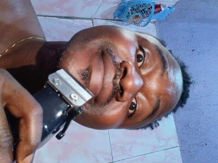 A man holds a black and silver electric hair clipper with the brand "ORONTO" visible on the blade. He's dark-skinned with short, curly hair, a mustache, and a gold chain. He appears to be giving himself a haircut. The background shows tiled flooring and a blue plastic basket containing small items. The image is taken at an angle, capturing his face and the clipper up close.
