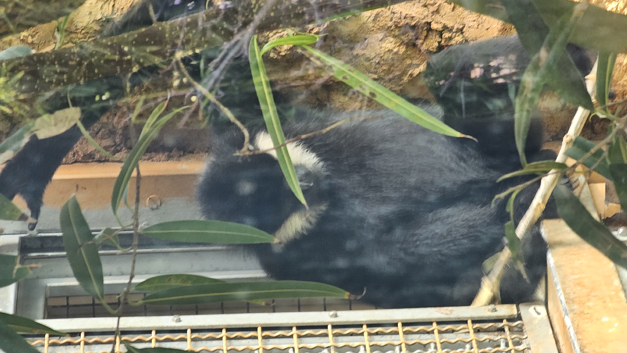 A dark-furred gibbon is observed seated within an indoor enclosure at the Frankfurt Zoo in Frankfurt, Germany. The primate, predominantly black or dark gray, exhibits distinct white fur markings around its head and upper chest, consistent with species such as the Pileated Gibbon. It is positioned with its body facing right and head slightly lowered. The scene is viewed through a clear glass barrier, which displays minor reflections and blurs foreground elements. Green foliage, comprising several leaves and thin branches, partially obscures the gibbon in the foreground. To the gibbon's immediate left, a metallic grate structure with small square openings is visible. Behind the gibbon, a textured wall or tree trunk, colored yellowish-brown and mottled with lighter patches, creates a naturalistic backdrop. A light-colored ledge or sill is present in the lower left portion of the frame. The lighting is ambient, illuminating the scene without harsh shadows. No other subjects or active interactions are visible.