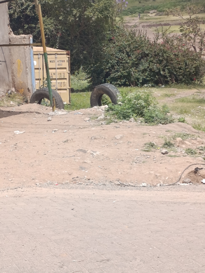 The scene depicts an outdoor environment in Matungulu west ward, Kenya, under direct sunlight. In the foreground, a light-colored paved surface composed of rectangular pavers is visible, likely a road or pathway. Immediately beyond this, an unpaved area of reddish-brown soil with scattered small rocks and debris extends into the midground. Two large, dark-colored vehicle tires are partially buried upright in the dirt in the midground. The tire on the left is positioned adjacent to a tan-colored shipping container, marked with "MSCU 473308 0 4201" and "CAP" stenciled text. This container is partially obscured by a grey concrete structure and a tall, yellow pole featuring a green band. Green vegetation, consisting of grass and various shrubs, grows around the tires and extends towards the background. The background is characterized by a dense cluster of green trees and bushes. Beyond this foliage, an open, lighter-toned field with sparse vegetation is visible, ascending gently. A solitary, faint human figure is observed walking across this distant field. No other individuals or specific interactions are discernible. The overall environment suggests a semi-developed or rural-fringe area.