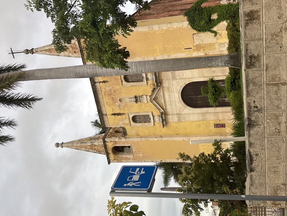The image depicts the exterior of the Iglesia de San Juan de Dios in Mérida, Mexico, observed from a slightly elevated street level under an overcast sky. The church features a faded yellow plaster facade with visible signs of weathering and peeling paint. It has two prominent pyramidal bell towers; the left tower contains an open archway, and the right tower is topped with a metal cross. A large, arched wooden main entrance is centrally located, framed by an ornate Baroque-style stone portal with pilasters and a pediment. Two rectangular windows with grates are situated above the entrance. Faint Latin inscriptions are visible along the frieze near the roofline. In the foreground on the left, a blue rectangular sign on a dark grey pole displays a white pictogram of a pedestrian alongside an open car door, signifying a drop-off or pick-up area. A low, rough-hewn stone wall spans the width of the lower image. Various green foliage is present, including a tall, slender palm tree trunk on the right, partially obscuring the church's right side. Trimmed green shrubs are planted along the base of the church, featuring a small, cross-shaped topiary directly in front of the main door and a larger, stylized topiary resembling a figure or a 'P' on the far right wall. No individuals or explicit actions are visible within the frame.