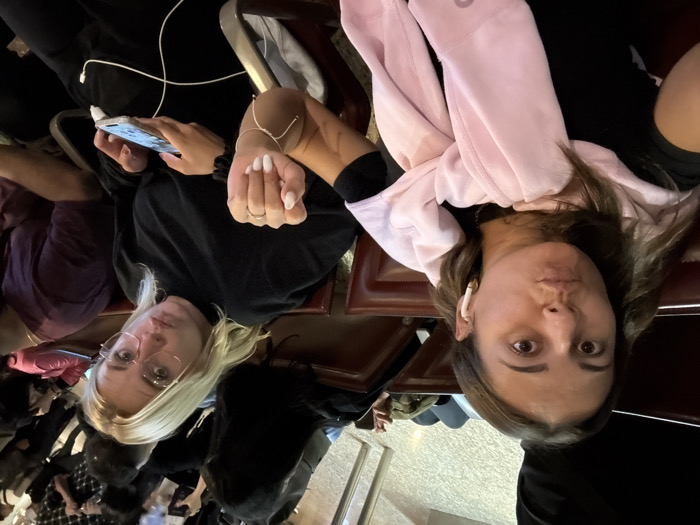 Two women sit in adjacent seats, one blonde wearing glasses and a black top, holding a phone charging, while the other wears a pink hoodie and black top. They both look directly at the camera. Other people are in the background, seated and standing. The seating appears to be in a public area, perhaps a waiting room or lounge.