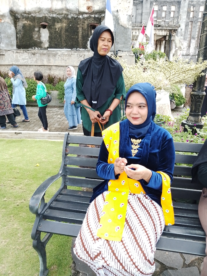 The image depicts an outdoor scene in Ngadirejo, Indonesia, featuring several individuals in a park or public area with an aged stone building in the background. In the foreground, a woman is seated on a black metal park bench, positioned slightly to the right of the frame's center. She wears a blue hijab, a dark blue velvet long-sleeved top, a white and brown patterned batik skirt, and a bright yellow scarf with white and red/purple dot patterns draped over her shoulders. A gold-colored brooch is affixed to her chest. Her hands are resting in front of her lap, revealing rings on her fingers and a bracelet on her left wrist. She looks to the right with a faint smile. The bench is a standard park model with slatted seat and backrest. Green grass covers the ground to the left and in front of the bench. Behind the seated woman, slightly to the left, a second woman stands. She wears a black hijab and a dark green long-sleeved top, holding a brown strap or bag in her right hand. She has a watch and bracelet on her left wrist and gazes towards the upper right, beyond the frame. Further in the midground, a paved walkway extends horizontally, populated by several individuals. From left to right, visible figures include: a person in a light blue long-sleeved top and light blue hijab; a person in a bright green long-sleeved top, black pants, carrying a black shoulder bag; and a person in a light blue denim-like dress and white hijab. Green bushes separate the walkway from the background structure. The background is dominated by a large, weathered stone or concrete building exhibiting visible cracks, discoloration, and structural features suggesting age or disrepair. Multiple flags are visible, including a white and blue flag, and at least two red and white Indonesian flags, positioned against or near the building. White flowering bushes or trees are also present in front of the building.