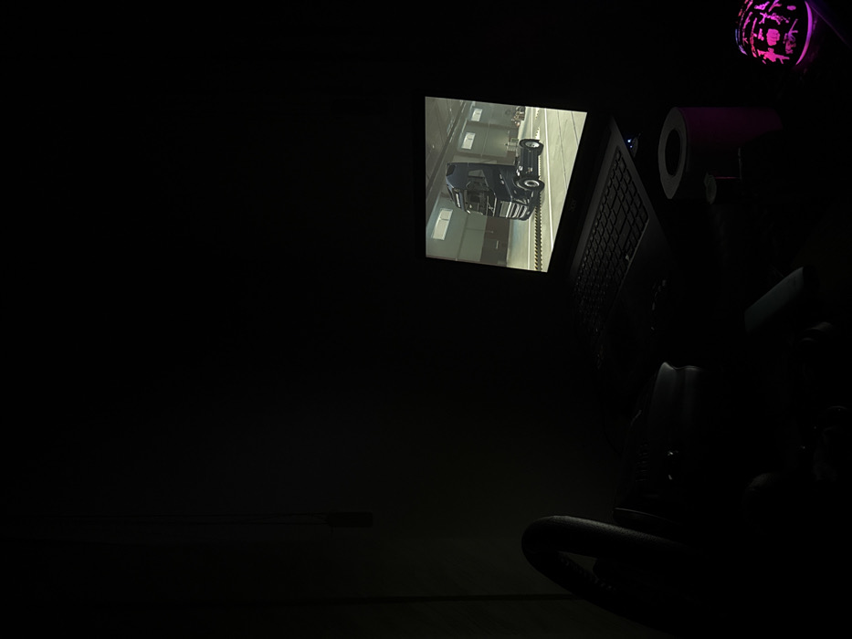 The image depicts an interior scene rendered in low light, originating from a room. A dark-colored Acer laptop is positioned centrally on a flat surface, open with its screen illuminated. The laptop display shows a black semi-truck tractor unit within what appears to be a digital garage or workshop environment, suggesting a video game or simulation. To the left of the laptop, a black gaming steering wheel controller is partially visible. To the right, a cylindrical object with a pink tint, possibly a roll of tape or labels, rests on the surface. Further to the right, an illuminated gaming mouse, displaying pink and purple light patterns, is visible. The immediate surroundings are dark, with minimal ambient light revealing faint outlines of other desk items and vertical elements along the left wall, possibly cables or structural features. No individuals are visible. The specific location within Kardzhali, Bulgaria, cannot be determined from the visual information provided.