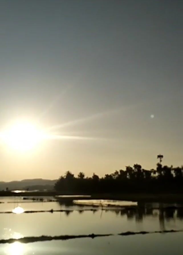 sun shining over a landscape of what appear to be rice paddies. The sun is bright and low in the sky, with sunbeams radiating out from it. The paddies are filled with water, and the reflection of the sun can be seen in the water. There are trees in the distance, silhouetted against the sky. A person's voice can be heard in the background.