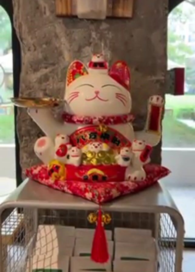 The camera is positioned indoors facing a Maneki Neko lucky cat figure