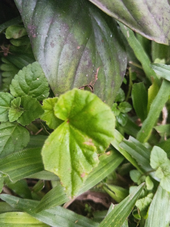 The image displays a detailed, close-up view of dense green plant foliage in the Mate Yehuda Regional Council, Israel. A single, bright green, somewhat heart-shaped leaf, exhibiting minor light brown discoloration on its surface, is the primary subject, positioned centrally in the lower foreground and rendered in sharp focus. Surrounding this central leaf are various other green plant species. To the immediate left, a cluster of smaller, darker green leaves with serrated edges is visible. Long, thin blades of green grass are interspersed across the lower, middle, and right sections of the frame. In the upper background, a larger, darker green leaf with visible venation and diffuse reddish-purple mottling is partially obscured. The scene consists exclusively of natural vegetation, depicting ground cover or undergrowth under ambient natural lighting. No individuals, animals, or manufactured objects are present.