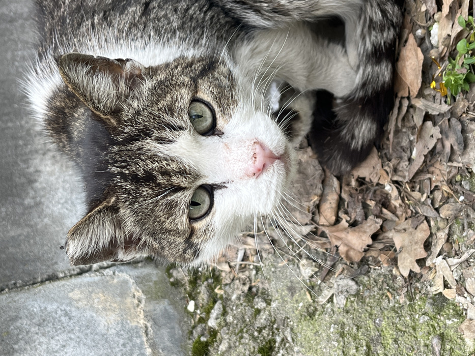 - "A domestic short-haired cat with a white face and chest, displaying dark tabby markings on its forehead, around the eyes, ears, and across its back and tail, is captured in a crouched position" by FM-dsQis2, licensed under CC BY 4.0