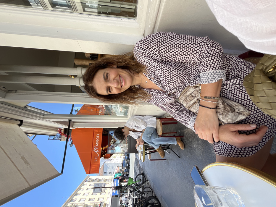 The image depicts a street-side cafe scene in Issy-les-Moulineaux, France. Two people are seated at a table outside the cafe, "Le Nemrod". A woman in a polka dot dress is seated at the table, wearing a brown leather purse and numerous bracelets on her left wrist. She is interacting with a younger person, sitting on a chair in the background. The person in the background is wearing a white long-sleeved shirt and blue jeans, and is holding a small white cup. The woman is sitting in the foreground, looking directly at the camera, and her legs are crossed. A glass of water, a mobile phone, and a woven bag are on the table between the two people. The cafe has a large orange awning with the name of the establishment in large white letters. The street is visible in the background, with various shops and trees. There is a red chair at the woman's table, and another chair and small table behind her, where the other person is seated. The cafe exterior is white, with several large windows. The scene is bathed in sunlight. The ambiance is casual and relaxed, with a hint of urban life.