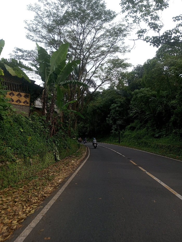 The image depicts a paved two-lane road in Sat Thay (East), Myanmar, curving gently to the right, observed from a low angle. The asphalt road features a solid white line on the left shoulder and a dashed yellow center line. In the mid-distance, a procession of at least three motorbikes with riders is traveling away from the viewer. The lead rider wears a light-colored helmet and dark clothing. To the left, a steep embankment rises, densely covered in various green foliage, including several prominent banana plants. Behind these plants and higher up the embankment, a light-brown wooden structure is partially visible, featuring a horizontal band of ornate yellow geometric or floral patterns. The ground along the immediate left roadside is covered with a layer of dry, brown leaves. To the right of the road, a dense forest with numerous tall trees forms a dark green, thick canopy. The sky above is overcast and light grey, suggesting diffused light conditions.