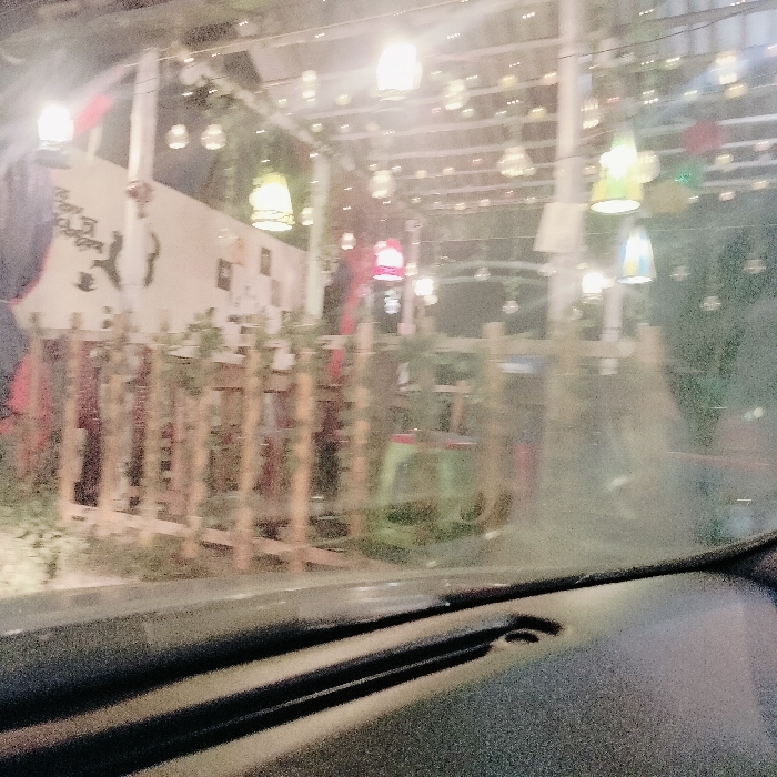 An indoor or covered outdoor space is decorated with numerous hanging lights and a wooden fence. The view is through a car windshield. Inside, there is a painted banner and some outdoor furniture. The scene is captured at night, emphasizing the illumination from the hanging lights.