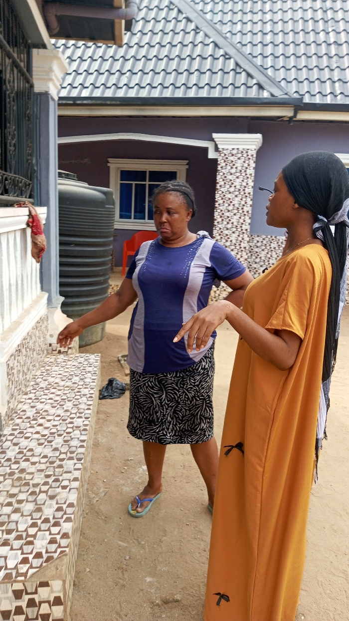 In Agburu Uke, Nigeria, two adult females are depicted outdoors on an unpaved dirt surface