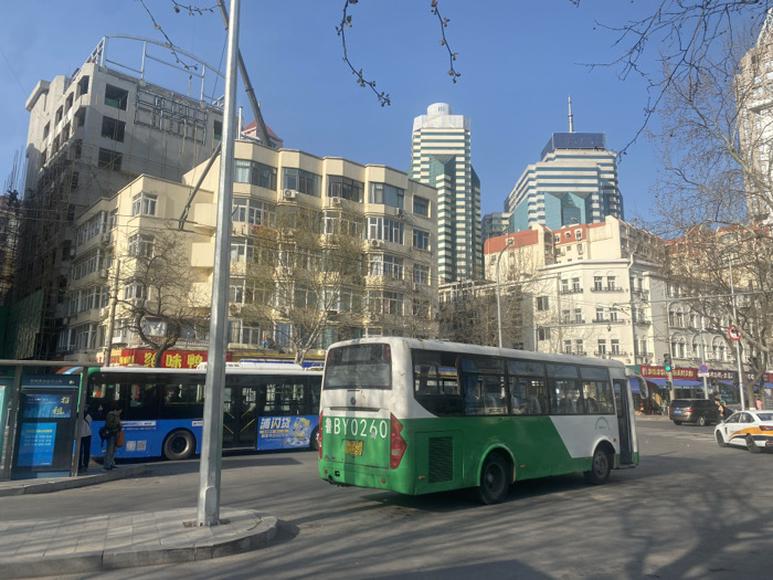 street scene in Qing Dao Shi, China, at the coordinates 36.063 latitude, 120.311 longitude. A green and white bus is parked on the right side of the street, facing the camera. There is a blue and white bus parked on the left side of the street, facing the opposite direction. The buses are both empty and do not have any passengers visible. The street is paved and there is a bus stop on the left side of the street, with a blue sign that says "60." On the left side of the street, there is a tall, multi-story building under construction. The building is covered in scaffolding and has a red sign with Chinese writing on it. On the right side of the street, there are multiple multi-story buildings. The buildings are in various states of repair and have windows, balconies, and signs. There are trees and vegetation in the foreground and background, and the sky is clear and blue. There are several pedestrians walking on the sidewalk and several vehicles are parked in the street. The vehicles include a white minivan, a white car, and a blue car. Several pedestrians are walking on the sidewalk in the background. The street appears to be busy with traffic and pedestrians.