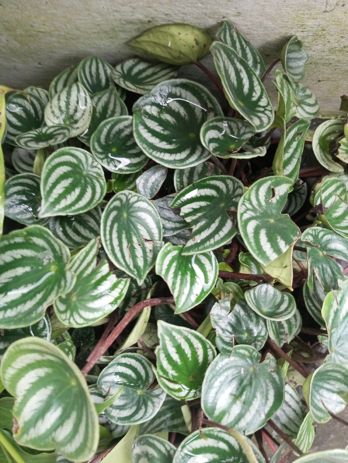 - "The image displays a dense cluster of Peperomia argyreia, commonly known as Watermelon Peperomia, viewed from a slightly elevated, overhead perspective" by FM-B8aSi2, licensed under CC BY 4.0