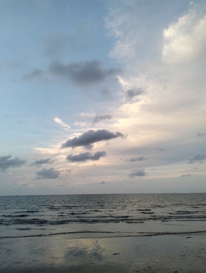 The image depicts a coastal scene in the city of Curehtunong, Indonesia, observed at what appears to be dusk or dawn. The sky occupies the upper two-fifths of the frame, displaying a gradient from light blue on the left to pale grey and muted yellow-white on the right, populated by scattered grey and white clouds of varying sizes and densities. A clear, flat horizon line horizontally bisects the image, separating the sky from the ocean. The middle ground consists of dark blue-grey ocean water exhibiting gentle, undulating waves. Approximately ten small, indistinct, dark shapes, consistent with distant boats or buoys, are visible along the far horizon of the water. The foreground comprises a wet beach of dark sand, reflecting the overhead sky and water, creating a shimmering effect with visible ripples and subtle textures on its surface. No individuals or active subjects are present within the frame.