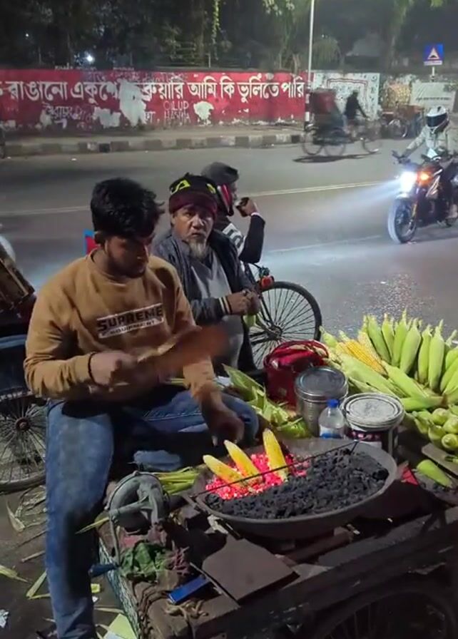 two men working at a street food stand at night. They are grilling corn on the cob over a charcoal grill that is sitting on a wheeled cart. The younger man is sitting on the cart and fanning the coals to keep them hot. The older man is sitting next to him and preparing the corn. Piles of unshucked corn cobs are neatly stacked on the side of the cart. The background shows a busy street with traffic including cars, motorcycles, and auto-rickshaws. Streetlights illuminate the scene. There is a wall with painted text on it behind the stand.