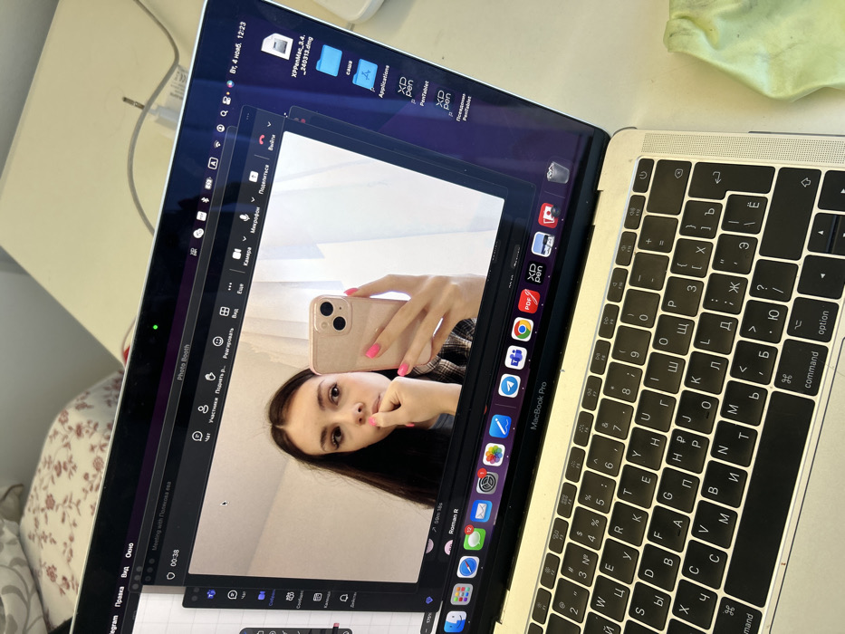 A laptop screen displays a Photo Booth image of a young woman taking a selfie with her phone. The woman has long brown hair and is wearing a plaid shirt. Various open application windows are visible in the background, including file folders and a video conferencing app with a chat window. The laptop keyboard is visible, with keys in a Cyrillic alphabet layout. The overall setting seems to be a personal or work space.