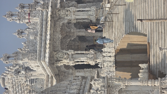 A white, ornate structure, likely a temple, occupies the left side of the image. The intricate carvings and architectural details create a visually rich texture. Several people are seen near the base, and some are ascending a set of stairs leading towards the structure. A corrugated metal wall is visible in the background on the right side. The lighting suggests daytime, with shadows cast on the steps and walls.