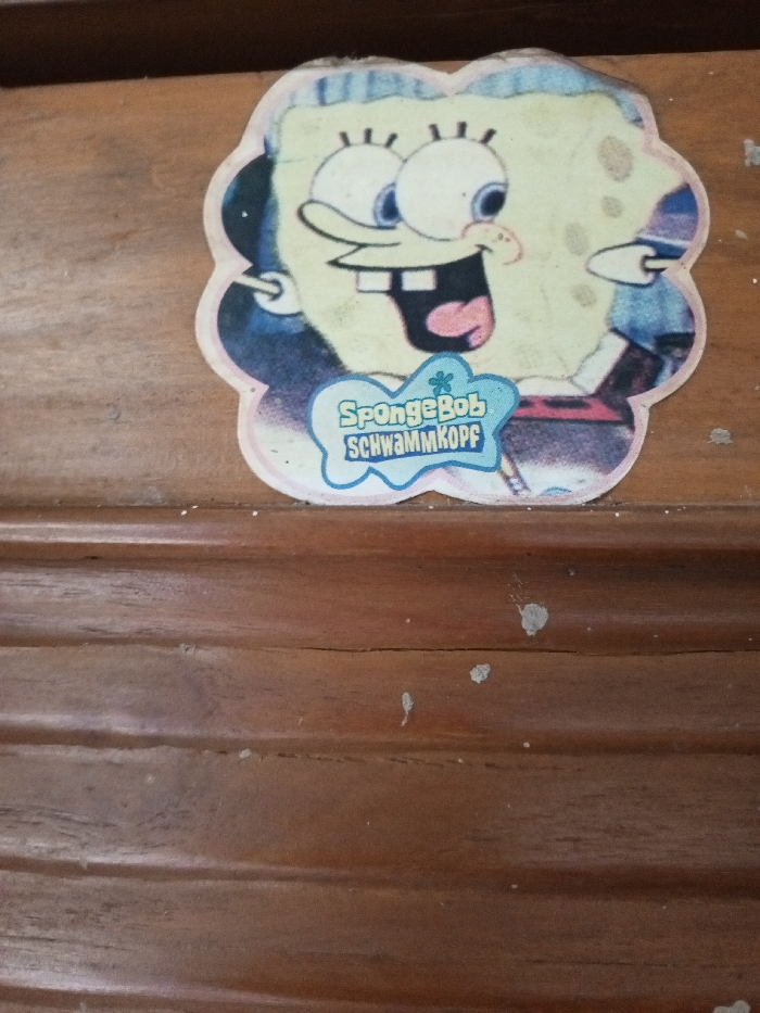 A faded Spongebob sticker adheres to a weathered, brown wooden surface