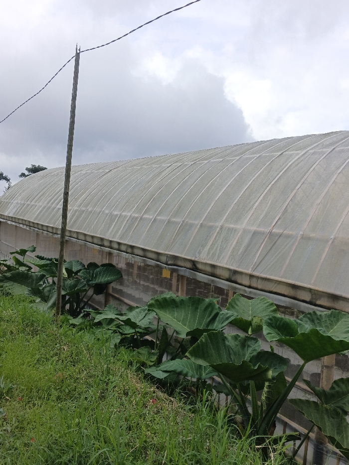 The image displays an elongated, semi-cylindrical greenhouse facility located in Pinnwe, Myanmar (Burma). The structure features a translucent, white fabric or plastic covering stretched over a bowed framework, rising from a lower wall constructed of concrete blocks. Multiple small, yellow rectangular objects, likely insect traps, are affixed to this concrete wall. In the immediate foreground and along the base of the greenhouse, a dense growth of broad-leafed, dark green plants, consistent with taro, is present, interspersed with overgrown green grass and smaller vegetation. A slender, light-colored wooden post stands vertically on the left side of the frame, with a single dark utility wire extending horizontally from its upper section across an overcast, cloudy sky. No individuals, specific actions, or interactions are visible within the scene.