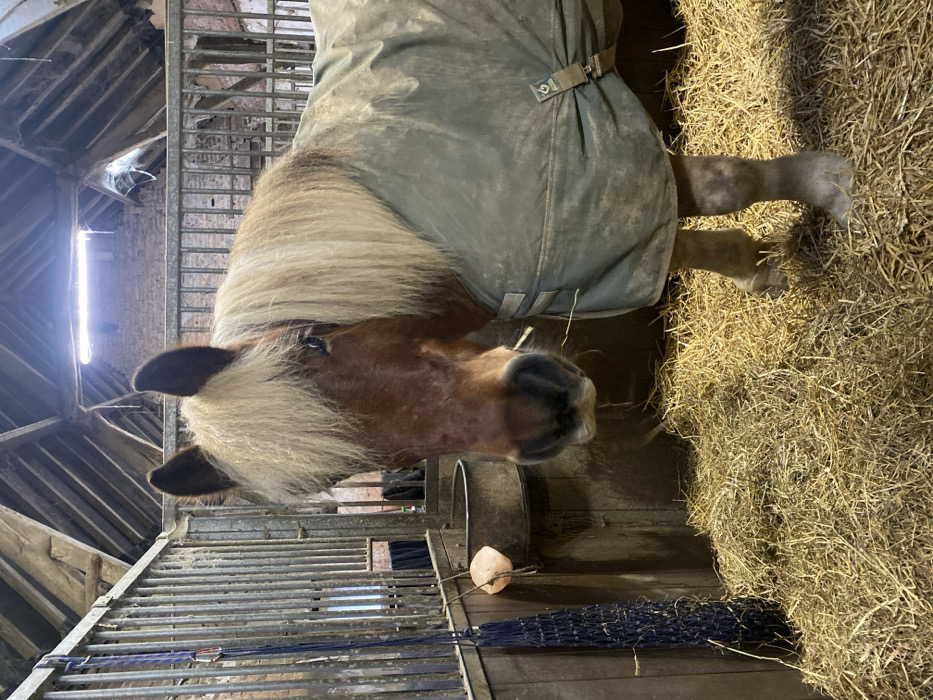 - "An image captured indoors within a stable or barn in Estaimpuis, Belgium, depicts a bay-colored horse wearing a dusty olive-green horse blanket, secured by visible straps and buckles" by FM-xTDQG2, licensed under CC BY 4.0