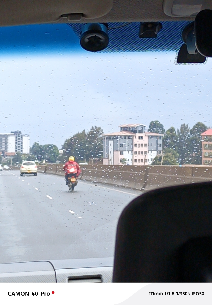 The image depicts a view from inside a vehicle looking through a rain-splattered windshield onto a multi-lane roadway in Gitaru ward, Kenya