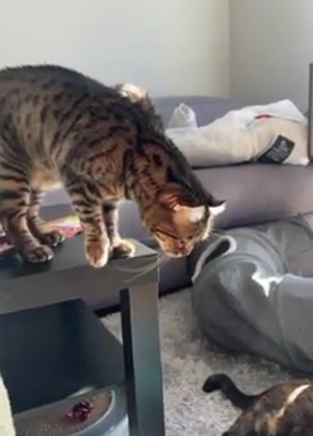 A short video shows two cats in a sunlit living room. One cat, a brown tabby, stands on a small black table, sniffing downwards. The second cat, a tortoiseshell, lies on a light gray carpet, stretched out towards the camera. Behind it, there is a gray cat tunnel, a pet bed with a striped pattern, and part of a gray couch with a white cushion. A blue and white cat toy lies on the floor next to the tortoiseshell cat. The tabby cat then moves off the table, and the tortoiseshell cat plays with the blue and white toy. The camera pans slightly to the right to capture the scene. In the background, there is a window, a framed picture on a shelf, and a cat tree.