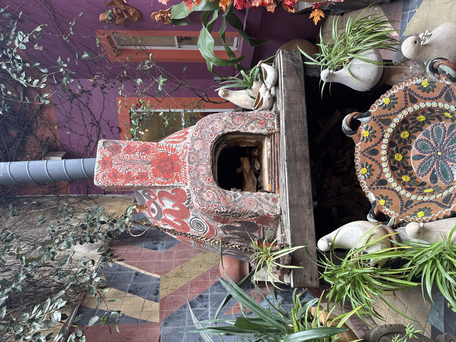 A whimsically decorated outdoor oven dominates the scene, adorned with red floral and swirling designs. It's mounted on a rustic wooden structure alongside ceramic dove figures and a large, patterned plate. Potted plants with long, green leaves add natural touches. The background features a purple building with orange trim and scattered decorative objects. The ground is covered in a tiled pattern of red, yellow, black, and grey. The entire scene has a quirky and artistic ambiance.