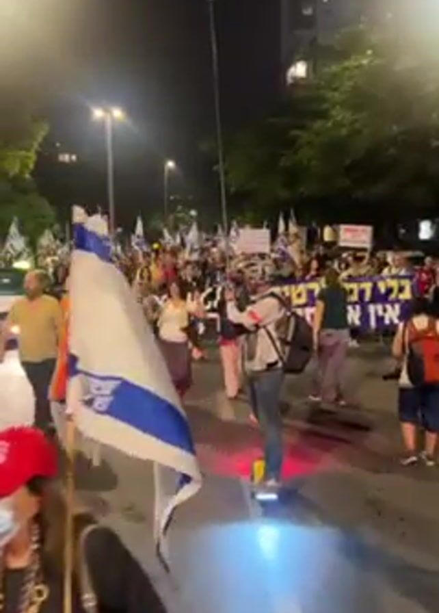 At night, a crowd of people participates in a street demonstration. The people are marching forward down a paved street lined with streetlights and trees. Most of them are carrying Israeli flags. Some are carrying signs, one of which reads, in Hebrew, "דלפה הדמוקרטיה מידינו"- possibly translating to "Democracy leaked from our hands." A man in a helmet stands on a lit single-wheeled electric scooter, filming the scene with his cell phone. Many people are looking in his direction. One woman in the foreground wears a red hat, face mask, and a long necklace with circular beads. Another person in the crowd wears an orange jumpsuit. A building is visible in the distance.