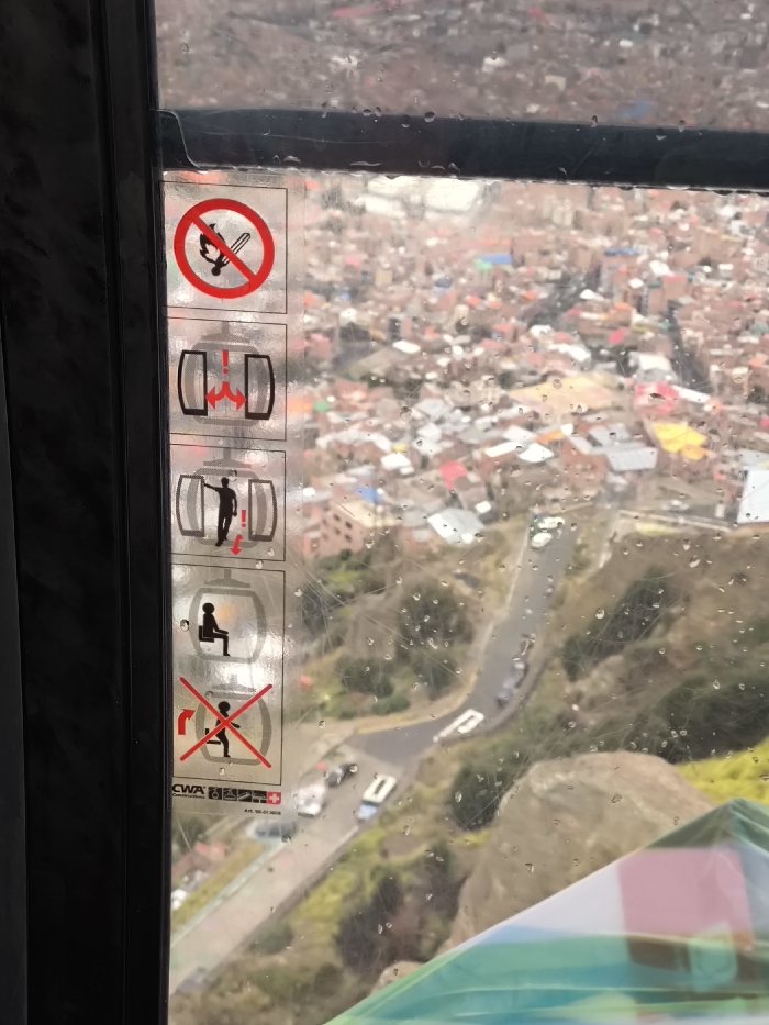 The image captures an aerial view of El Alto, Bolivia, from inside a cable car cabin