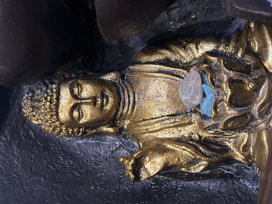 The scene is situated in Palma de Mallorca, Spain. It depicts a close-up of a small, gilded Buddha statue. The statue, crafted from a material resembling bronze or gold-finished resin, is seated in a meditative posture with eyes closed and a serene expression. Its hair is styled in small, tightly curled bumps. The figure's robes are detailed with folds and drapes. The left hand is raised in a gesture with the thumb and index finger touching (Vitarka Mudra). The right hand is cupped at the level of the lap, holding a lotus-shaped vessel. This vessel contains several irregularly shaped, bright turquoise-blue stones or crystals, topped centrally by a single, pale beige, spiraled seashell. The statue is set against a dark, textured background, possibly sculpted stone or an abstract wall, exhibiting faint lighter streaks. A large, dark, out-of-focus object, consistent with a human finger or thumb, partially obscures the upper right quadrant of the image, running vertically alongside the Buddha's right side. The scene is illuminated by direct light, accentuating the texture and metallic sheen of the statue.