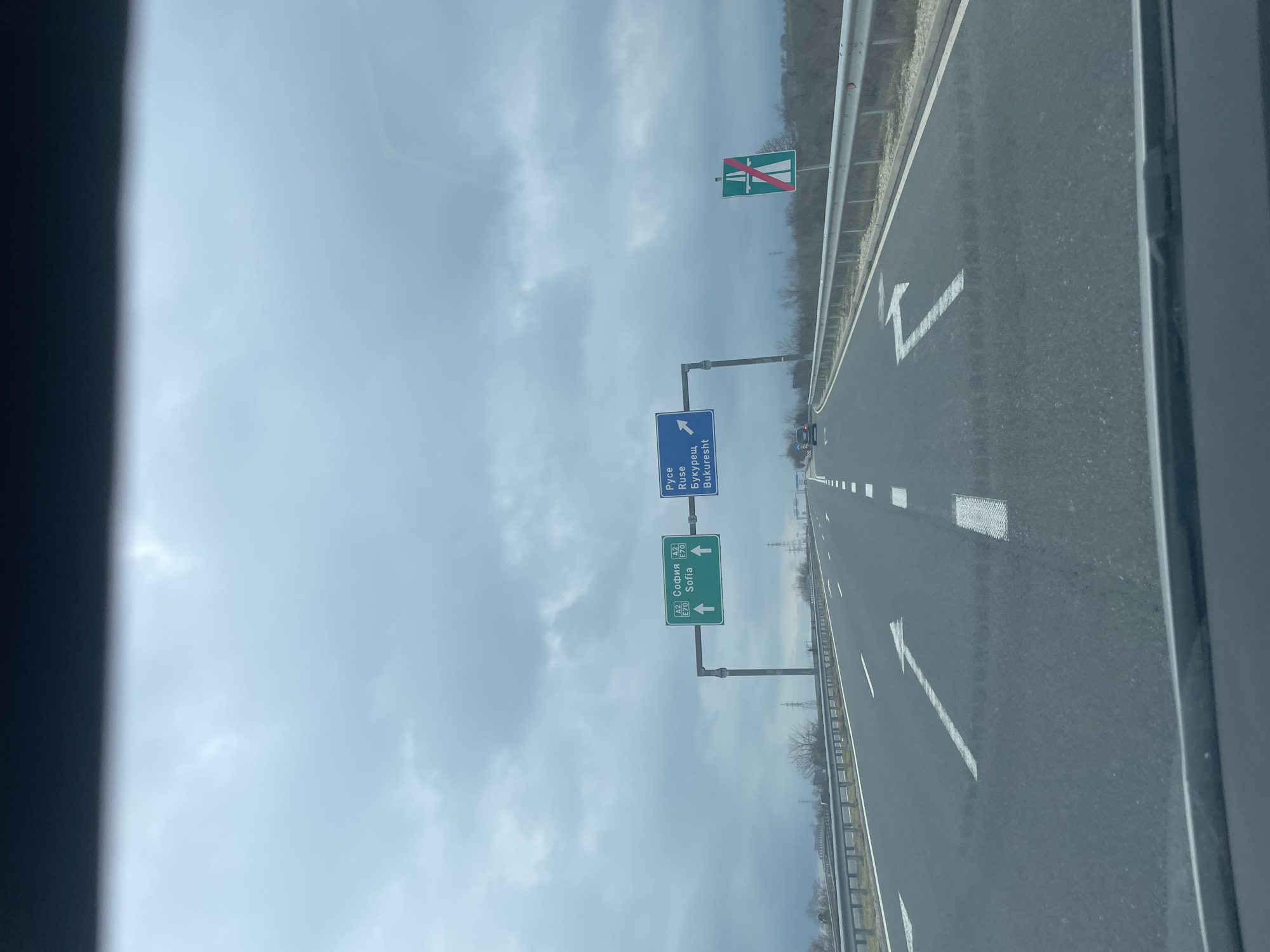 multi-lane highway outside of Gradishte, Bulgaria. Signage indicates that Sofia is in one direction, and Ruse and Bucharest are in the other. An end-of-highway sign is also visible. The sky is overcast. The view appears to be from inside a vehicle.