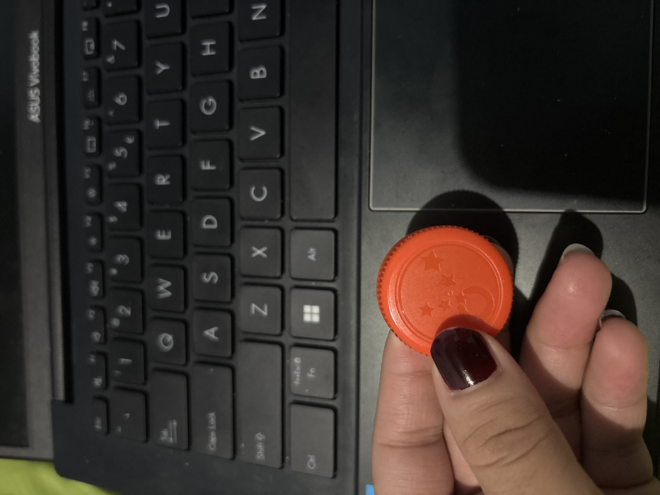 A close-up shot shows a black ASUS Vivobook laptop keyboard, with an orange plastic lid resting on the side next to the touchpad and held by a hand with dark red nail polish. The lid is round and has a pattern of stars and a crescent moon. The keyboard layout is visible, showing standard keys like "QWERTY," "Caps Lock," and "Shift." The laptop's trackpad is situated to the right of the keyboard.