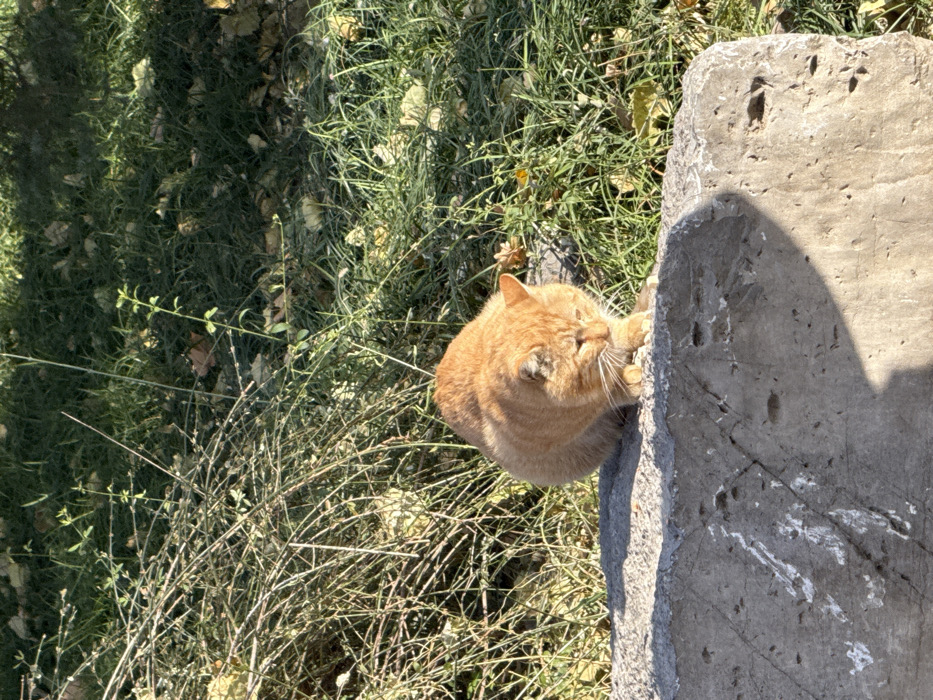 An orange cat is clawing at a large, gray concrete structure outside in the sun. To the left of the cat is sparse, dry brush, and behind the cat is green grass. The concrete structure appears weathered and has some white stains. A dark shadow is cast over the right side of the structure.