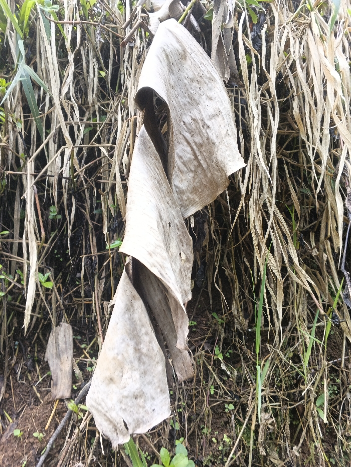 A close-up shows a decaying scene. The focal point is a large, beige, withered leaf hanging vertically. Behind it, a dense thicket of dried, light-brown grass-like stems creates a textured backdrop. Patches of dark, moist soil and sporadic green vegetation are visible. The overall impression is one of decomposition and the transition between seasons.