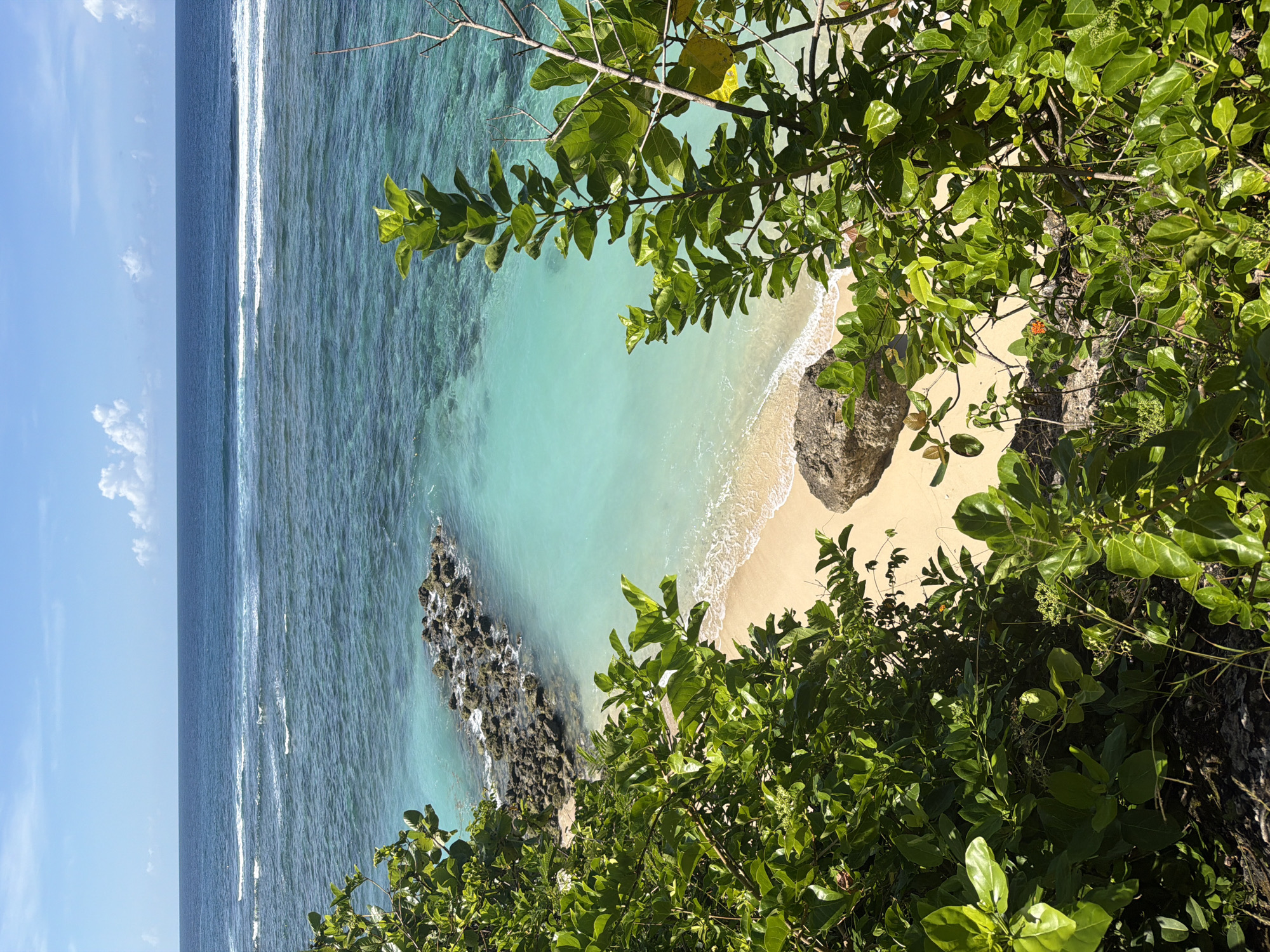 The image depicts a tropical beach in Benoa, Indonesia. The viewpoint is from an elevated position, looking down at the shoreline. Lush, green vegetation frames the right and lower portion of the image. The beach is a light sand color, with gentle waves lapping at the shore. The ocean transitions from a light turquoise near the beach to a deeper blue further out. A rocky outcrop extends into the water near the left side of the beach. The sky is visible on the left, with a few scattered clouds.