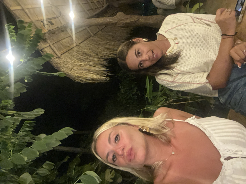 Two adult females are captured in a medium close-up at night in Dikwella, Sri Lanka. The subject on the left, with blonde hair, wears a white spaghetti-strap top with a ruffled neckline and a light-colored necklace, along with large, intricate gold-toned earrings. She is positioned slightly forward, looking directly at the camera with her lips pursed as if blowing a kiss. The subject on the right, with dark brown hair, wears a light cream-colored mesh short-sleeved top with visible reddish-pink stitching on the seams, and multiple necklaces including shell-shaped and red coral-like elements. She also wears rings on both hands and is seated, looking towards the camera with a slight smile. The background is dark, indicating nighttime, and features lush green foliage. To the upper right, a structure with a thatched roof is visible, suggesting an open-air or semi-outdoor setting, possibly a restaurant or bar. Bright artificial light sources are present in the upper right, illuminating the subjects and parts of the environment. The overall scene suggests a casual social interaction.