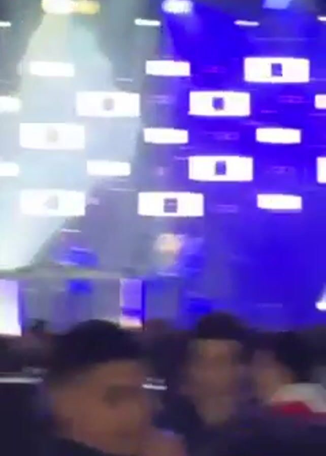 band performing on a brightly lit stage. The band consists of three members: one playing a keyboard, one playing a guitar, and one who appears to be singing. The stage lighting is predominantly blue and white, with occasional yellow tints. A large crowd is visible in front of the stage, watching the performance. The camera seems to be handheld and moves slightly, focusing mostly on the band on stage and the crowd in the foreground. The background shows a white screen or wall with a pattern of light-blue rectangles.