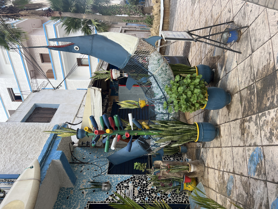 The image depicts a public outdoor area in M'diq, Morocco, characterized by an environmental art installation. The foreground features a paved surface composed of square, light-colored flagstones exhibiting scattered dark stains and wet patches. Central to the scene is a large, upright sculpture of a blue and white marlin, fabricated from metal and mesh, functioning as a recycling receptacle. Its body cavity is filled with clear plastic bottles. The marlin has a pointed bill, a single circular eye on its head, and a partially open mouth. Adjacent to the marlin, to its left, stands a tall, green, pole-like structure adorned with multiple colorful, repurposed bottle-neck forms protruding horizontally. Some of these bottle-neck forms, as well as several blue pots at the base and top of this structure, contain upright snake plants (Sansevieria trifasciata). Another large blue pot holding a bushy green plant, possibly a geranium, is positioned directly in front of the marlin's head. Numerous other potted plants, primarily snake plants in blue and yellow pots of varying sizes, are arranged across the paved area, particularly along the left side. To the left, a building facade is visible, partially covered in a mosaic of blue and white tiles. A dark blue roller shutter covers a ground-level entrance. Above this, a white surfboard is horizontally mounted on a blue architectural element. A hanging sign, partially visible, displays the word "artisanal." In the background and to the right, multi-story white buildings with blue trim on balconies and window frames are observed. One upper-story window features closed brown shutters. Overhead, utility lines traverse the scene. On the far right, a palm tree is visible. Near the base of the marlin sculpture, an A-frame sign stand, dark in color, supports a white board. A small blue bucket rests on the pavement directly beneath this stand. A drainage grate is visible in the paved ground near the marlin's tail. No people are present within the depicted scene.