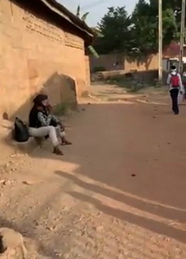 dirt road in what appears to be a small village or rural area. A person is sitting on steps in front of a building to the left. A line of children, some wearing red shirts with "TIGERS" on them and others in green shirts, walk along the road. An older woman with a patterned shawl carries a white bucket alongside the line of children. Another person with a red backpack walks in the opposite direction of the children. Buildings of brick or concrete are visible along the road, and trees are present. The sky is overcast.