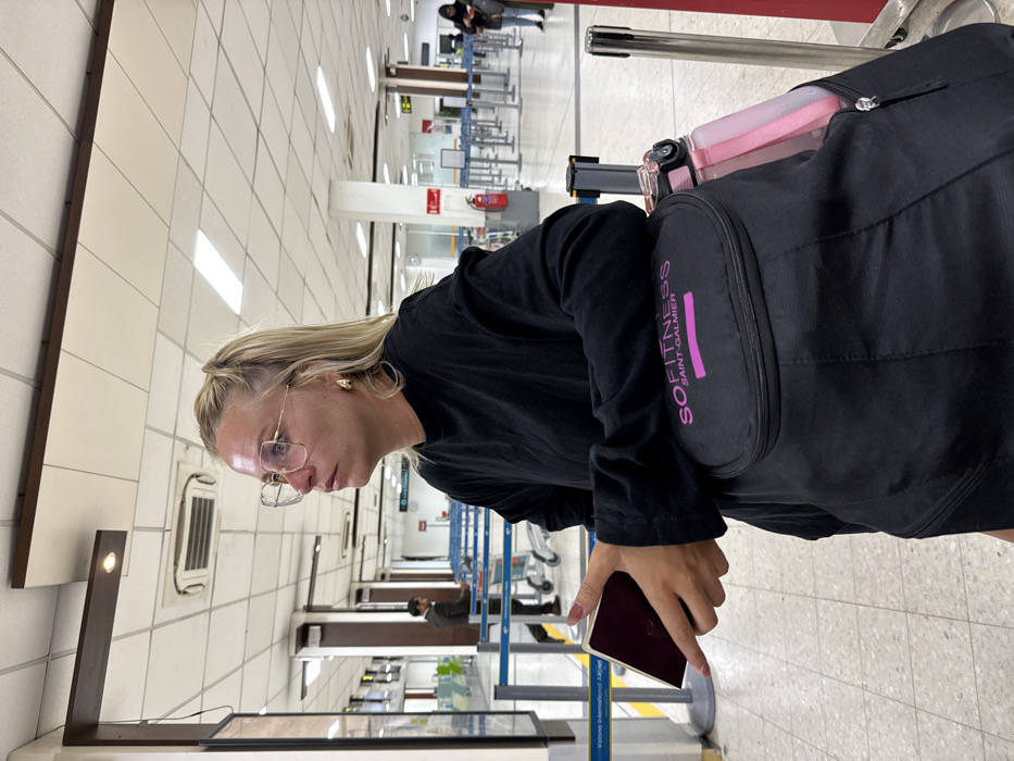 The image depicts the interior of Velana International Airport in Malé, Maldives. The central subject is a blonde female, seen from the torso up, looking towards her left. Her blonde hair is pulled back into a ponytail. She wears rectangular eyeglasses with thin gold frames and gold-colored hoop earrings. Her fingernails are painted light pink. She is dressed in a black long-sleeved top. In her right hand, she holds a maroon passport beneath which a dark-colored smartphone is visible. Her left arm rests on a black backpack which is positioned on the handle of a rolling suitcase, partially visible. The backpack features "SOFITNESS SAINT-GALMIER" in pink text on its top flap. A pink water bottle is secured in a mesh side pocket of the backpack. The airport environment includes a light-colored tiled floor and a white grid ceiling with rectangular fluorescent lighting fixtures and air conditioning vents. In the background, numerous blue and silver stanchions form queuing lines. A partially visible sign on the left reads "Velana International Airport". A red fire extinguisher is mounted on a column in the mid-right background. Other individuals are present in the background: a male in a dark suit to the mid-left, and a person wearing a dark head covering in the far right.