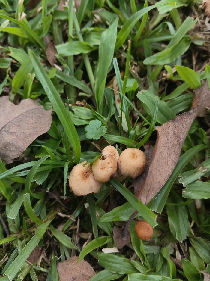 A patch of green grass is interspersed with brown leaves and small, light brown mushrooms
