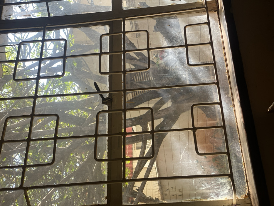 - "The image displays an exterior view from within a building in Nairobi, Kenya, observed through a dirty window fitted with light-colored metal security bars" by FM-nhoeR2, licensed under CC BY 4.0
