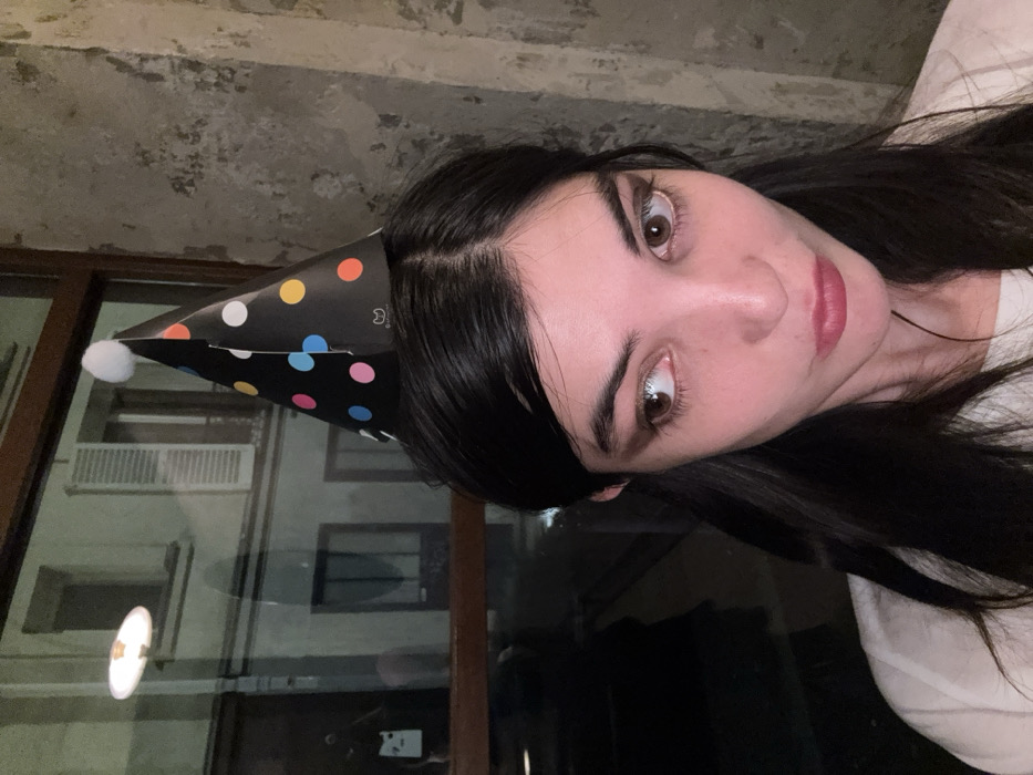 A young adult female is depicted in a close-up, chest-up indoor shot at night in Paris, France. She wears a white t-shirt and a black conical party hat with multi-colored polka dots (pink, light blue, yellow, orange) and a white pom-pom. Her dark hair is parted down the middle, framing her face with prominent dark eyebrows and eye makeup. She gazes to her right with a slightly pouting or puckered facial expression. To her left, a large window with a dark wooden frame reveals a blurred exterior view of a Parisian building across a street, featuring a window with closed white louvered shutters. A bright, circular light source reflects prominently in the window, alongside a faint reflection of a person wearing a white t-shirt with a white cartoon character visible on it. The street is dark, indicating nighttime. To her right, a textured, greyish-brown stone or concrete wall is visible.