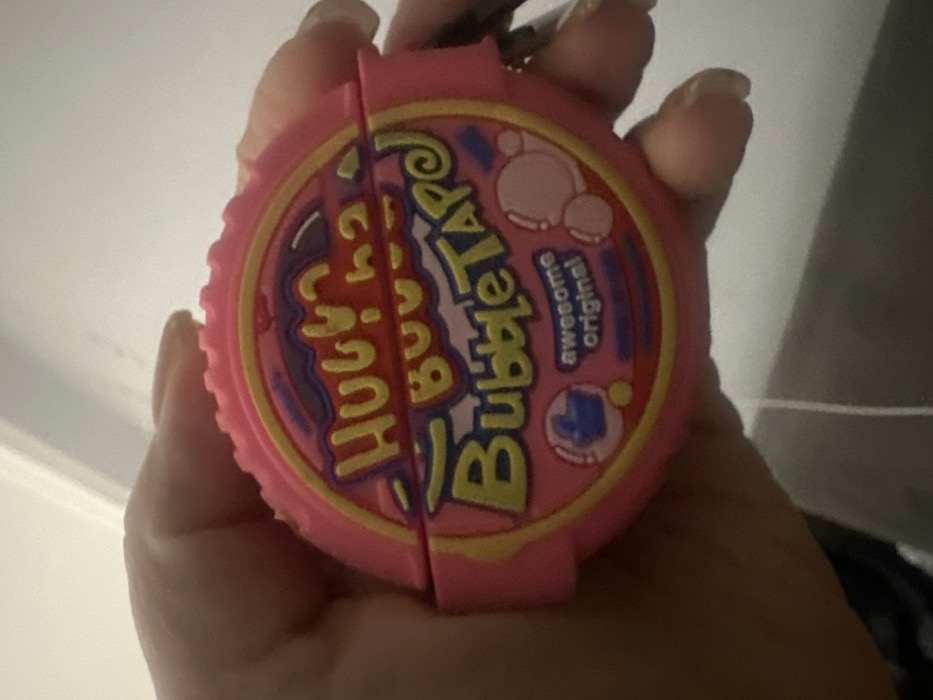 - "A human hand firmly holds a pink, circular protective case designed to resemble a Hubba Bubba Bubble Tape package" by FM-A9VGa2, licensed under CC BY 4.0